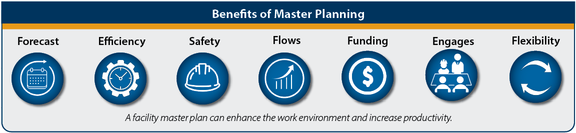- Efficiency - Facility master planning boosts operational efficiency by streamlining workflows, reducing waste, and minimizing unnecessary movement. It creates a smarter, more agile environment where every square foot supports productivity and purpose.