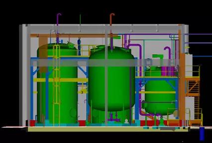 Process/Piping/Mechanical Design. The process design for the project revolved around raw material transfer, storage, and batching. Matrix’s process and piping engineers developed the P&IDs with the customer team and used its 3D modeling software along with the point cloud to engineer the interconnecting piping between the raw material tanks, batch tank, flammable storage room, and filler. The Matrix team also developed tank and mechanical equipment specifications and aided the customer by vetting bids and making recommendations for the purchase of tank and mechanical equipment.